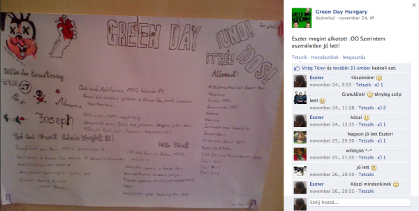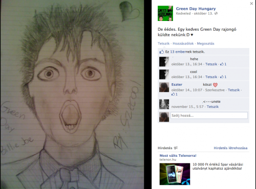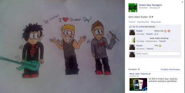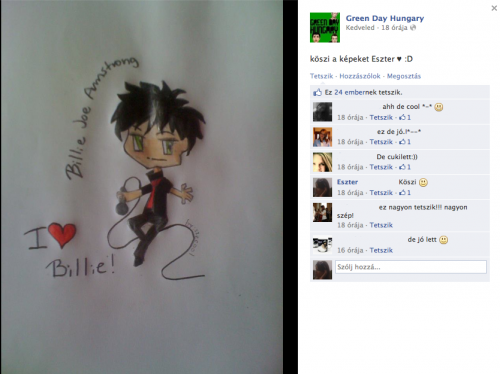 Sziasztok megszeretném köszönni a Green Day Hungary Facebook oldalnak hogy kirakta a rajzaimat és a videómat ! Zseniális oldal!!! Ja meg a kedves kommenteket! Még este is lesznek Hírek!